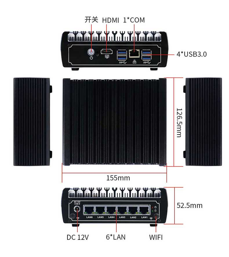 1个 HDMI接口(无声音输出) 4个 USB3.0,1个电源开关,1个 RJ45串口(支持 CONSOLE功能)